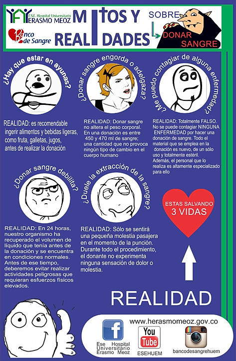 EL BANCO DE SANGRE DE LA ESE HOSPITAL UNIVERSITARIO ERASMO MEOZ CONSTANTEMENTE DENTRO DE SU PROGRAMA DE SENSIBILIZACION A LA DONACIÓN VOLUNTARIA QUE REALIZA ACLARA LA INFORMACIÓN CORRECTA SOBRE LOS MITOS Y REALIDADES DE DONAR SANGRE, YA QUE EL DESCONOCIMIENTO ES UN OBSTÁCULO QUE COHÍBE A LAS PERSONAS A SER DONANTE Y SALVAR VIDAS.